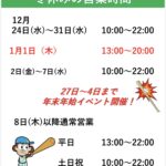 - 冬休みの営業時間について12月24日より冬休み営業時間として平日も朝10時よりオープンします! 27日から1月4日までは年末年始イベント開催! ご来店お待ちしています!