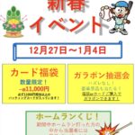 - 年末年始イベント開催!12月27日から1月4日までの期間年末年始イベントを開催いたします! この期間にご来店されお得なカード福袋やガラポン抽選会、ホームランくじで 豪華景品をゲットしよう!!