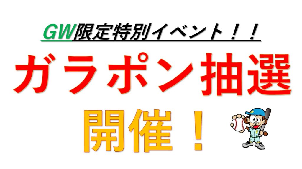 GW限定!ガラポン抽選!! 2023年4月29日 最終更新日時 : 2023年4月30日 piensa-battingcenter GW限定特別イベントとして、5月3日~7日までガラポン抽選を開催致します! ハズレなし!バッティングカードなど景品が当たります! バッティングカードご購入で抽選に参加できます!
