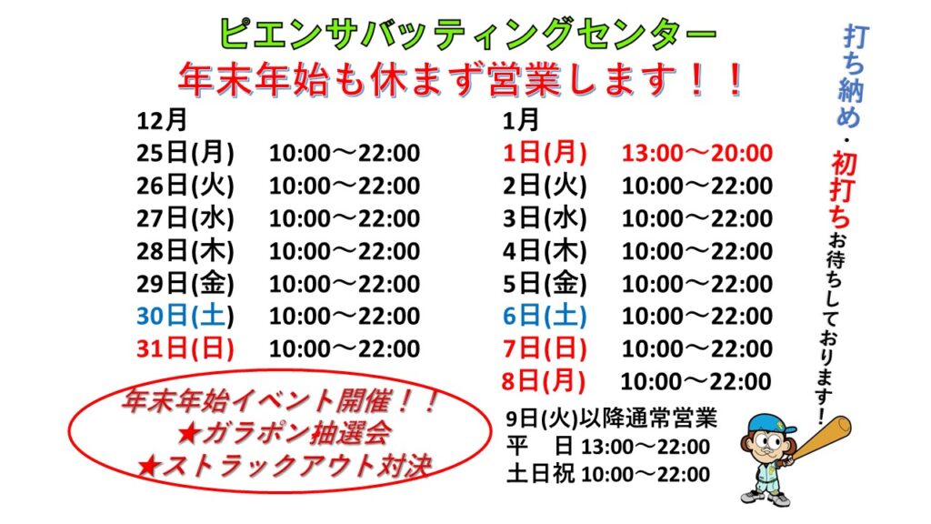年末年始の営業時間のおしらせ! 2023年12月15日 最終更新日時 : 2023年12月15日 piensa-battingcenter 年末年始も休まず営業します! 元旦のみ13:00~22:00の営業です! 年末年始特別イベントも開催予定です! 皆様のご来店お待ちしております!