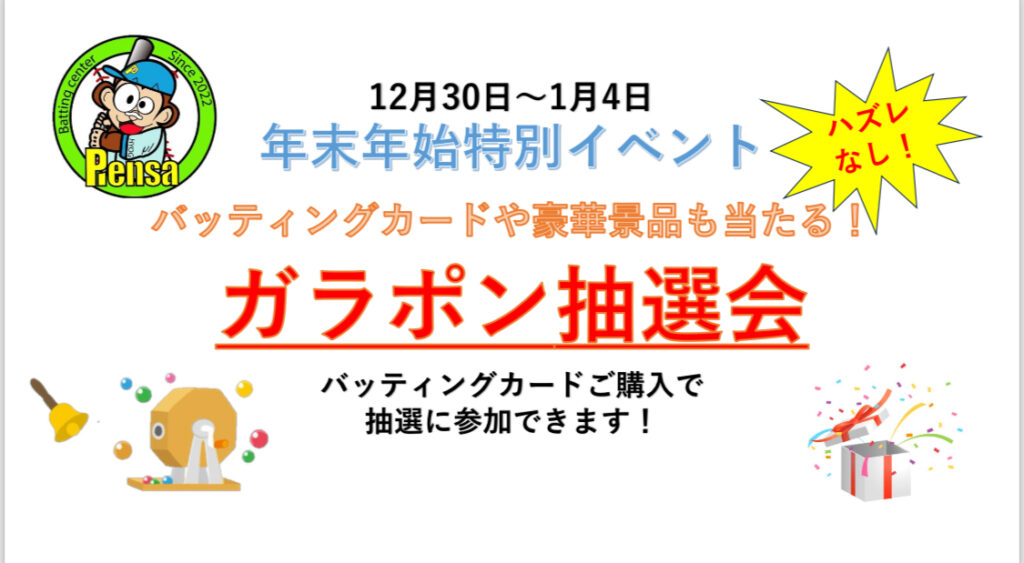 年末年始イベント~ガラポン抽選会~ 2023年12月17日 最終更新日時 : 2023年12月17日 piensa-battingcenter 12月30日~1月4日までガラポン抽選会を開催します! カードご購入でガラポンできます! ハズレなしでバッティングカードなど豪華景品が当たります! 皆様のご来店お待ちしています!