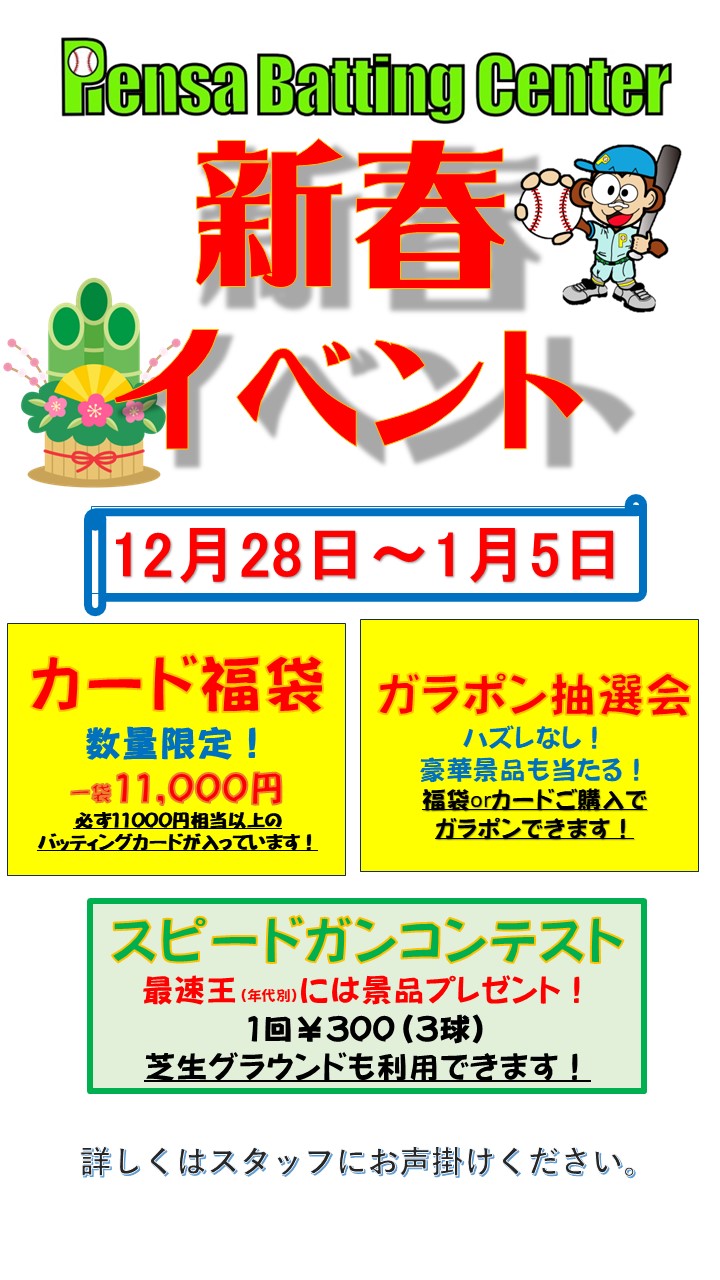 年末年始イベント開催! 2024年12月25日 最終更新日時 : 2025年1月17日 piensa-battingcenter 年末年始イベントを開催します! チームメイトやお友達、ご家族、ご親戚など皆様でのご来店をお待ちしております!