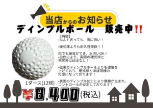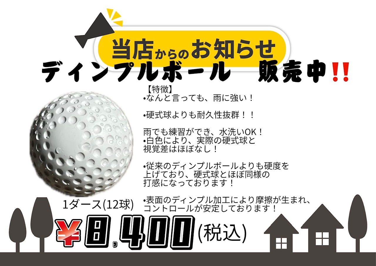 ディンプルボール販売中! 2026年2月3日 最終更新日時 : 2026年2月3日 piensa-battingcenter 硬式球より耐久性があり、雨も気にせずご利用できます!濡れても拭くだけでOK! ご自宅やチームの練習にいかがですか!!